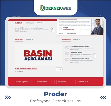 - Sezgisel ve Güçlü Yönetim Paneli: Kullanıcı dostu Proder paneli sayesinde dernek sitesi içeriğinizi, üyelerinizi, finansal verilerinizi ve tüm modülleri teknik bilgiye ihtiyaç duymadan, tam kontrolle yönetin.
